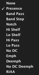The No DC type is a special form of high pass filter designed for archival recordings made with EIAJ adapters, so called “F1” recorders, which were short lived consumer digital audio recorders manufactured by Sony, Matsushita and others. They employed very simple, low cost converters and often injected a large amount of DC offset into the signal to overcome crossover distortion. This filter will remove that DC offset. Lastly, the “NoDC/DeEmp” type is, again, a special filter for recordings made with an EIAJ adapter that both removes DC offset and applies de–emphasis.